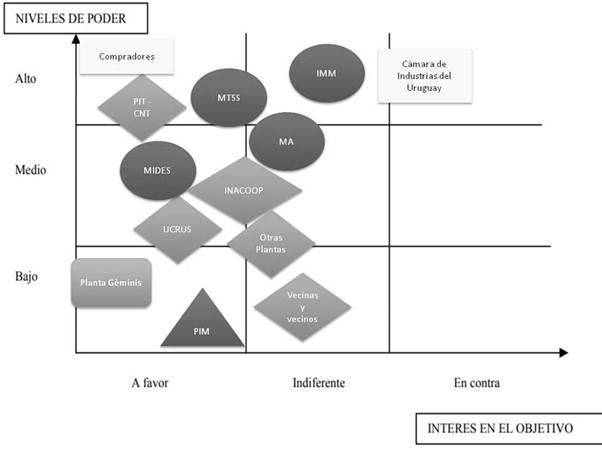 En trabajos de mapeo de actores, los propios trabajadores de la planta Géminis se ubican en el sector opuesto a la Cámara de la Industria, y entre ellos hay una multiplicidad de actores que van de una alta afinidad a poca o nada, así como de muy alto nivel de poder a bajo. Se observa así que consideran al PIM con bajo nivel de incidencia, así como con alto nivel de afinidad (véase gráfico 1).